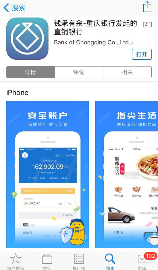 钱承有余App上线于2017年2月,是重庆银行打造的2.0版直销银行App,不过新旧版切换产生了不少问题。首先,部分手机应用商店模糊搜索“重庆银行+直销”仍有新旧两个版本。其次,重庆银行直销银行PC官网扫描二维码下载的依然是旧版,也没有相关升级公告。更重要的是,新版和旧版并不完全互通,新版注册用户不能登录旧版,但旧版注册用户可以登录新版,前提是解约旧版账户内全部签约产品,但电话客服表示,一旦解约,就不能重新签约。