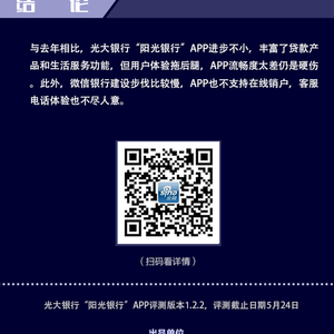 整体来看,阳光银行APP过去一年进步较大,获客战略也不错,但APP体验设计、多端融合发展等仍有提升空间。