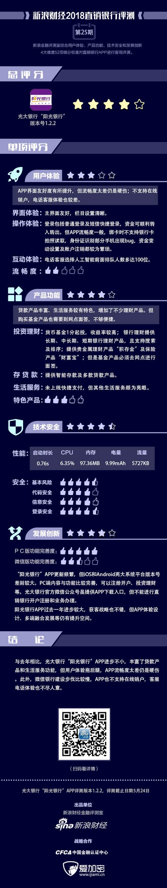 金融评测室综合用户体验、产品功能、技术安全、发展创新4大维度,52余项细分指标对光大银行阳光银行APP进行全扫描,最终给予4星评级(最高评级5星)。