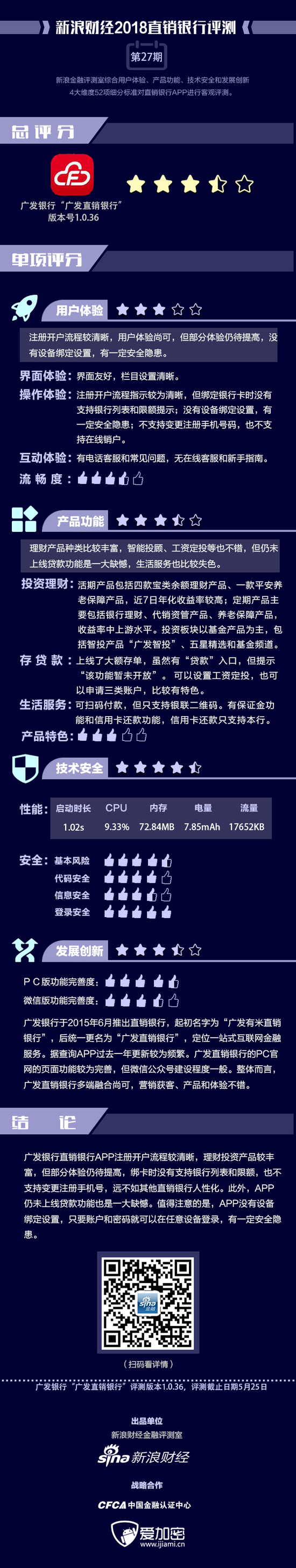 金融评测室综合用户体验、产品功能、技术安全、发展创新4大维度,52余项细分指标对广发直销银行APP进行全扫描,最终给予3.5星评级(最高评级5星)。