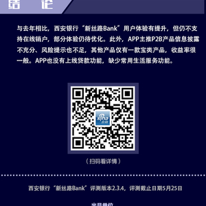 与去年相比,西安银行“新丝路Bank”用户体验有提升,但仍不支持在线销户,部分体验仍待优化。此外,APP主推P2B产品信息披露不充分、风险提示也不足,其他产品仅有一款宝类产品,收益率很一般。APP也没有上线贷款功能,缺少常用生活服务功能。