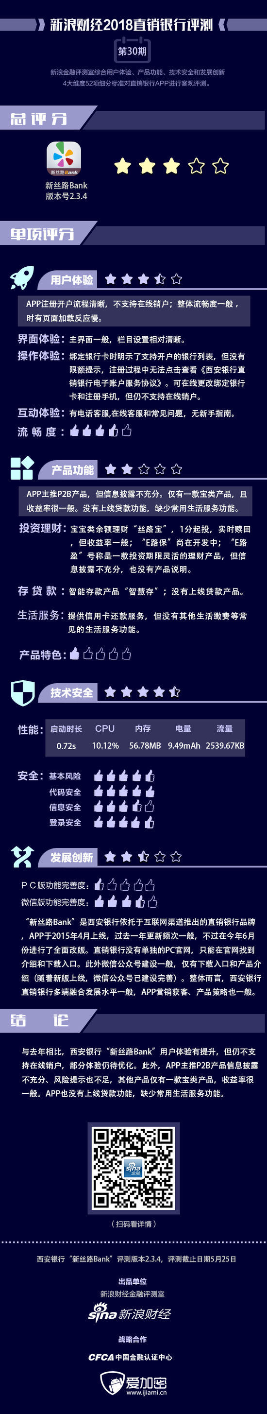 金融评测室综合用户体验、产品功能、技术安全、发展创新4大维度,52余项细分指标对西安银行“新丝路Bank”APP进行全扫描,最终给予3星评级(最高评级5星)。