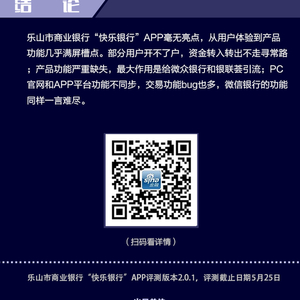 乐山市商业银行“快乐银行”APP毫无亮点,从功能体验到产品功能,再到创新体验几乎满屏槽点。部分用户开不了户,资金转入不设密码让人“窒息”;产品功能严重缺失,最大作用是给微众银行和银联荟引流;PC官网和APP平台功能不同步,交易功能bug也多,微信银行的功能同样一言难尽,哎!