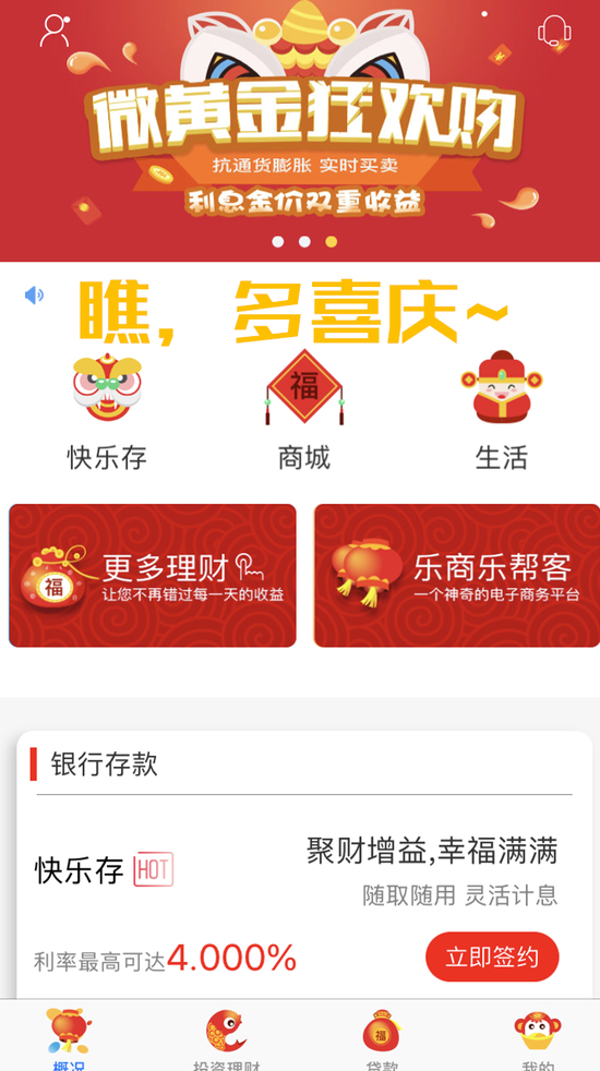 APP主界面虽友好,但浓浓的年味到底要闹哪样?底边栏分为“概况”、“投资理财”、“贷款“、“我的”四大板块。