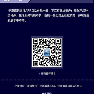 宁夏直销银行APP互动体验一般,不支持在线销户;理财产品种类稀少,生活服务功能不多,性能一般但安全系数较高,多端融合发展水平不高。