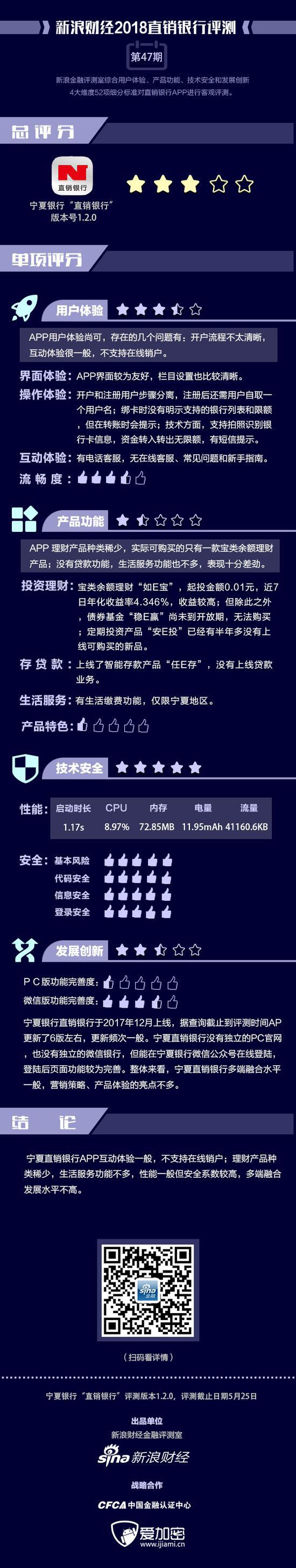 金融评测室综合用户体验、产品功能、技术安全、发展创新4大维度,52余项细分指标对宁夏直销银行APP进行全扫描,最终给予3星评级(最高评级5星)。