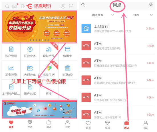 华夏银行APP界面友好度一般,首页主功能区可以设置N个常用功能键,但头屏仅显示12个位置,且夹在上下两个推广位中间。底边栏分为“首页、生活、周边、我的”四个功能板块,而“周边”仅提供网点查询功能,也不可进行预约等,此版块设置比较鸡肋——如果用户想查网点,大概率会点开任何一个地图应用软件,而且还能自动导航。