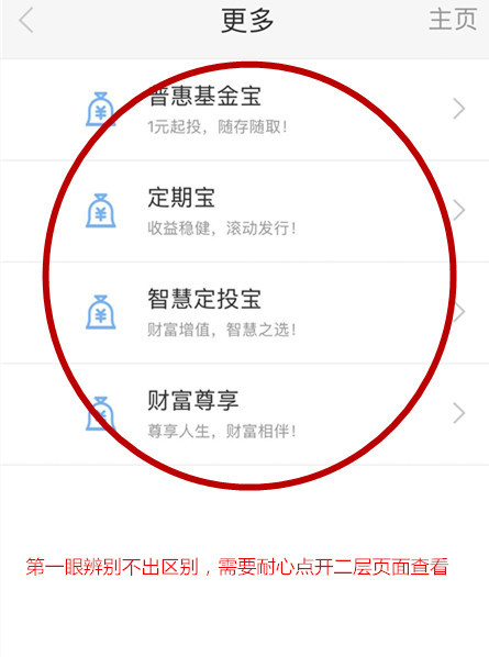 投资理财方面,APP和去年一样未设有单独的“理财”页面,如果想找理财产品需要点击“更多”去查找,同时多数产品页面仍采用比较原始的列表样式(比如银行理财、基金页面等),某些产品缺乏必要说明,比如普惠宝。