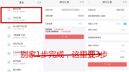 对于常用的转账汇款方面,华夏银行APP有“汇款业务”专版,功能较完善,支持银行账户/手机号转账,可以本人账户互转;添加银行账户后智能读取银行,可以选择转出银行卡;可以管理收款人、查询转账记录,但无法搜索收款人、管理转账额度。此外,操作之间关联程度不够,功能较全但用户并不觉得好用。比如,普通用户转账汇款最大的功能需求是“把多少钱汇给谁”,而让用户先区分“跨行汇款”还是“行内汇款”意义不大。