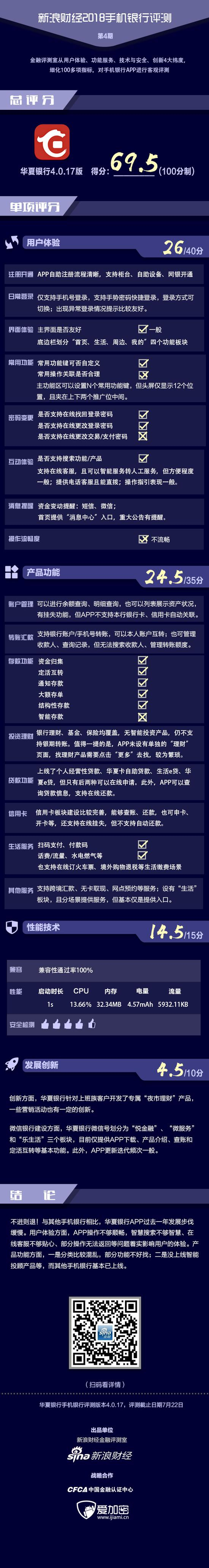 移动安全方面,新浪金融评测室合作方“爱加密”提供的数据显示,华夏银行APP安全性能较高,部分检测项仅存在1项“中危”检测项。