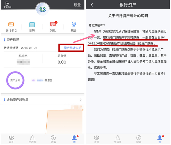 民生银行APP账户管理功能比较完善,提示可签约账户,用户手动加挂;可以进行余额查询、明细查询,也有资产负债总览图形化动态展示;可以进行银行卡挂失,也可以在线申请II类账户。值得注意的是,资产负债不能同步展示也有时滞,不过“资产统计说明”提示比较明显,但也仍需提高。