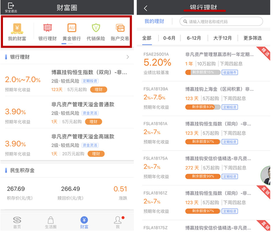 民生银行APP所有的理财功能收纳于“财富”板块,产品设置细分为银行理财、黄金银行、代销保险、账户交易、储蓄服务、代销产品和外汇买卖,产品设置比较清晰。不过,银行理财、代销产品等主推产品板块依然是原始列表式。