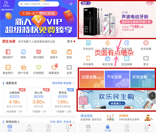 民生银行APP主界面友好,底边栏划分为“首页、生活圈、财富、我”四个功能板块。值得一提的是,民生APP整体设计比较清爽,不过生活圈页面被各种色块切割,略显嘈杂。