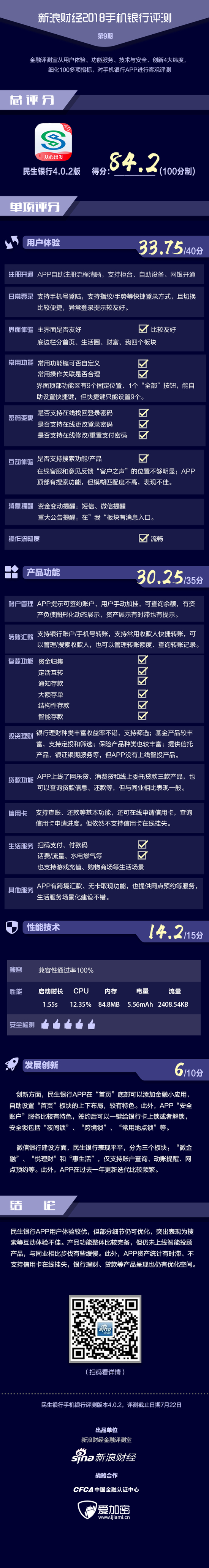 移动安全方面,新浪金融评测室合作方“爱加密”提供的数据显示,民生银行APP安全性能指标较高,但部分检测项存在1个中危漏洞。