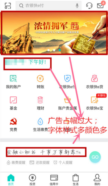 农业银行APP主界面比较友好,底边栏划分为“首页、投资、信用卡、生活、我的”五个功能板块。不过,首页广告占幅较大,字体样式多颜色多,略显凌乱。