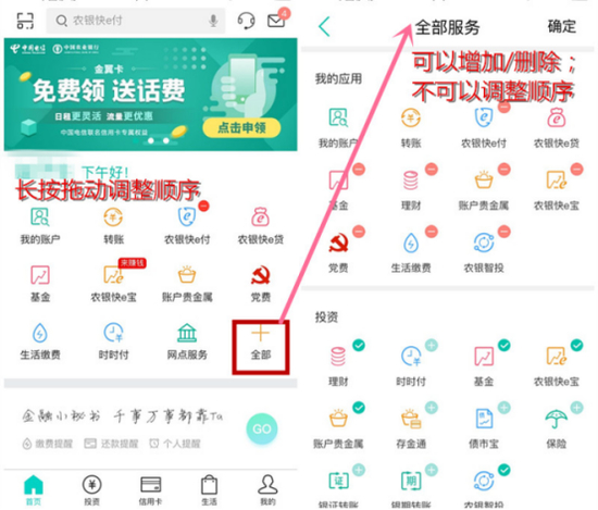 APP首页主功能区有11个固定位置和1个“全部”按钮。用户可以点击“全部”查看所有功能,也可以查看“最近使用”的功能,点击右上角“编辑”可以增加/删除常用功能键。值得注意的是,在“全部→编辑”页面不可以调整功能键顺序,在“首页”可以长按拖动调整顺序,操作逻辑略显复杂,其他银行一般策略是添加/删除/调整顺序均在一个页面完成。