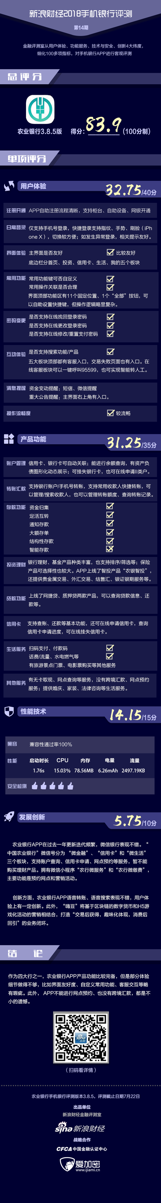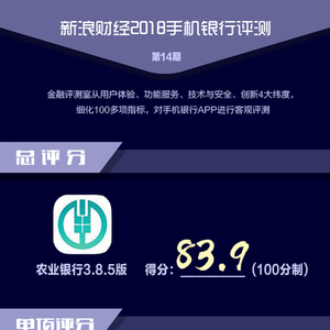 移动安全方面,新浪金融评测室合作方“爱加密”提供的数据显示,农业银行APP安全性能指标较高,但部分检测项存在1个低危漏洞。