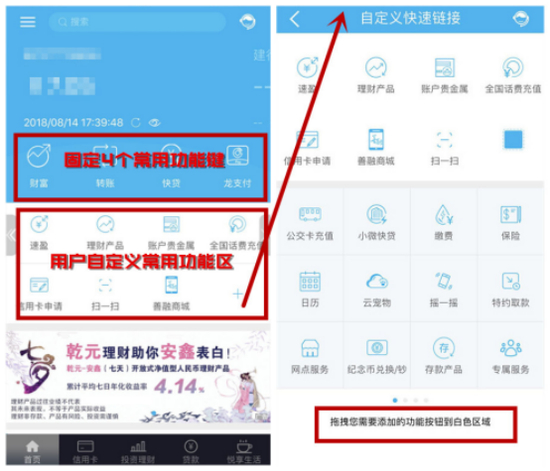 建设银行APP首页固顶4个常用功能,主功能区有7个固定位置和1个“+”按钮,用户可以点击“+”查看所有功能。用户可以自定义快速链接,且操作便捷,可以拖动调整顺序。其中,账户查询、转账汇款、交易查询等均可以实现一步到位。