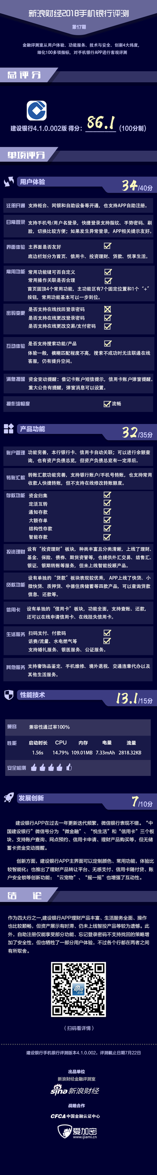 移动安全方面,新浪金融评测室合作方“爱加密”提供的数据显示,建设银行APP安全性能指标较高,但检出2项“中危”检测项。