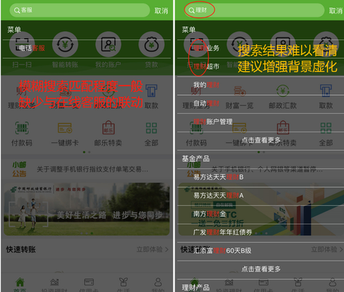 搜索互动方面,邮储银行APP支持在首页、生活页面搜索,但模糊搜索匹配程度一般,缺少与在线客服的联动。此外,建议增强背景的虚化处理程度。