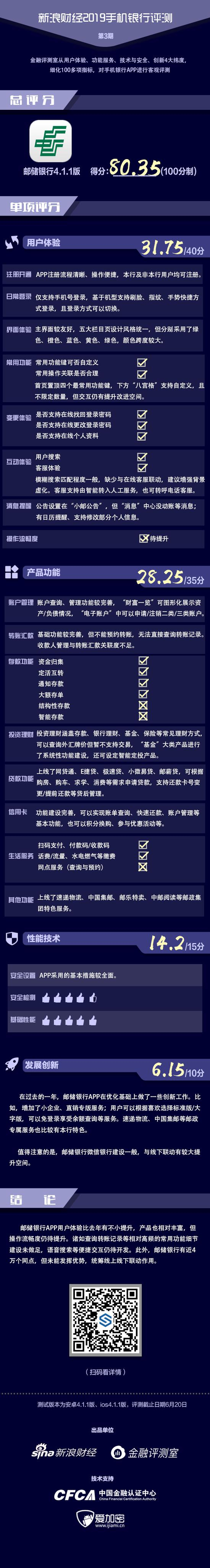 金融评测室综合用户体验、产品功能、性能安全、创新发展4大维度,150多项细分指标对邮储银行手机银行APP进行全扫描,最终给予80.35分(总分100),排名较去年有提升。