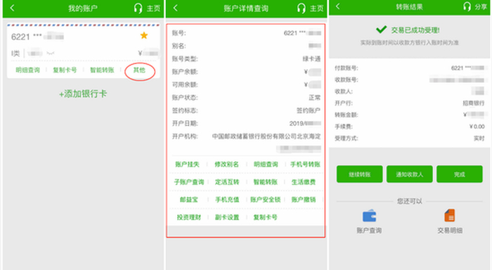 邮储银行APP常用操作便捷,诸如账户查询、转账汇款、信用卡还款、生活缴费等大多数功能均可实现一步到位。值得一提的是,用户登录后默认“我的”页面,也会显示最近使用过的三个功能+全部功能,比较方便。此外,APP功能关联合理,诸如查询储蓄卡账户可以关联汇款、交易明细、账户挂失等操作;转账完成之后关联继续转账、通知收款人等常用操作。