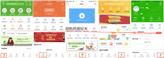 邮储银行APP主界面比较友好,底边栏分为“首页”、“投资理财”、“信用卡”、“生活”、“我的”五大栏目,比较清晰易懂。其中,每个栏目页设计风格较统一,但分别采用了绿色、橙色、蓝色、黄色、绿色,颜色跨度较大。