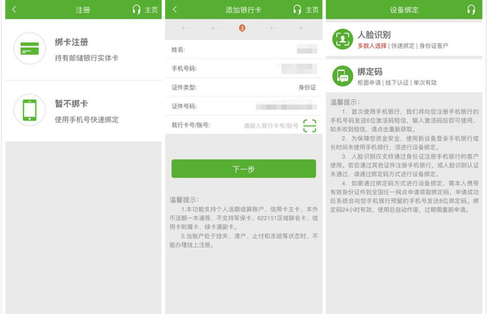 邮储银行手机银行注册开通方式丰富,用户可以在APP自助注册,也可以通过柜台、自助设备和网银开通。其中,本行及非本行用户均可完成注册,且注册流程清晰、操作便捷。值得注意的是,非本行用户注册完成后提醒绑卡,但绑卡仅限定于本行卡。