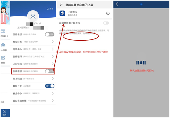 客服互动方面,上海银行APP在首页导航条“+”里可以找到在线客服,也可以设置成浮窗模式,也支持智能转人工客服。但与不断进化的同业相比,仍有不小的差距:第一,在线客服连接时间较长;第二,一些银行已经实现“用户操作遇到问题时代入客服”,省去用户重复操作流程,而浮窗模式虽然可以“随时找到客服”,但并没有真正“联通客服”,还牺牲了部分界面体验;第三,部分银行已经提供“理财经理”专业服务。
