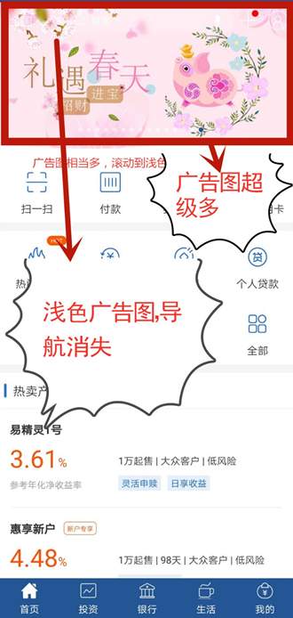 上海银行APP采用了底边栏+侧边栏的整体交互模式,底边栏分为“首页、投资、银行、生活、我的”5个风格比较统一的栏目页。不过,APP首页顶部滚动广告占比不小,且数量有17条之多,如果广告图底色浅会看不到上方导航键。