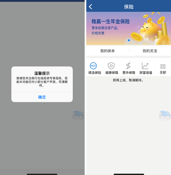 相对理财,基金、保险等大类建设缺乏系统,产品丰富度一般,保险中“精选保险”和“意外保障”也暂没上线。此外,与去年评测时一样,APP暂不支持外汇交易、贵金属交易,“在线投资专家”仍然仅对小部分客户开放,询问客服得到的回答是并不清楚对哪些客户开放,此项设置显得诚意不足。