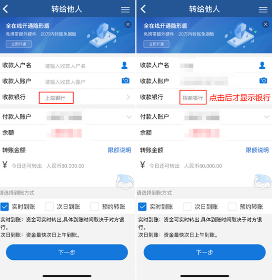 不过,也有一个小问题:“转给他人”收款银行默认回显“上海银行”,用户输完卡号之后需要点击一下才能回显银行通道,同业基本没有这种设置。