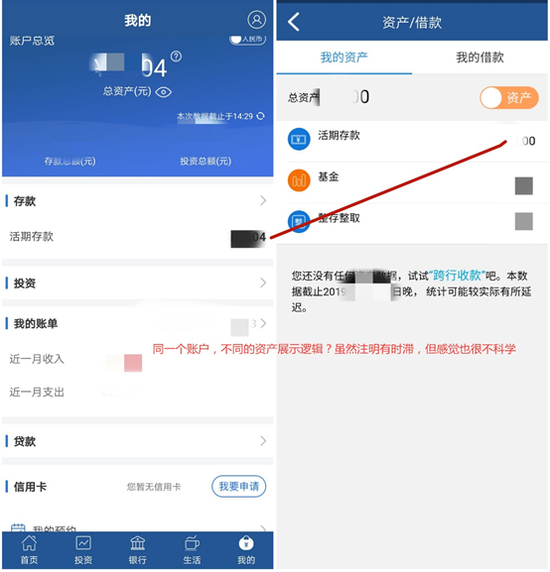 上海银行APP“我的”栏目页顶部展示账户总资产(但无总负债),存款、投资、收支情况(账单一词易混淆),贷款、信用卡情况,且同步时间比较合理。但是,在“全部→查询”中有“资产/借款”,虽然也囊括各个类目,但连活期存款的统计时滞都相当长。同样的资产/负债查询,却是展示两个不同结果,功能逻辑待捋顺。