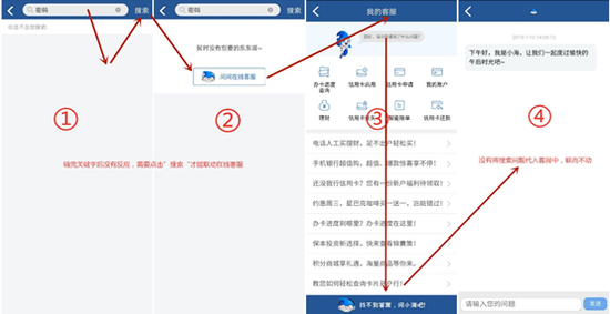 搜索互动方面,上海银行APP只在首页设置搜索入口,支持语音搜索、可以联动在线客服,但模糊搜索匹配程度不高,联动客服水平也不高。第一,搜索“客服”时提示“拨打客服热线”,但点击后提示“页面不存在”且持续加载(但其实APP支持一键拨打电话客服)。第二,搜索“密码”等无法匹配内容时,需要点击“搜索”才提示“问问在线客服”;第三,从搜索入口进入在线客服,发现只是跳往客服页面,仍需要再次点击才能进入,也无法代入搜索内容。