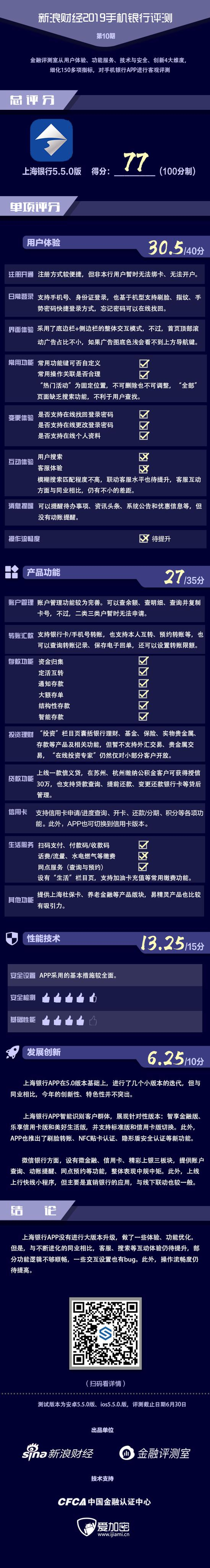 金融评测室综合用户体验、产品功能、性能安全、创新发展4大维度,150多项细分指标对上海银行手机银行APP进行全扫描,最终给予77分(总分100)。