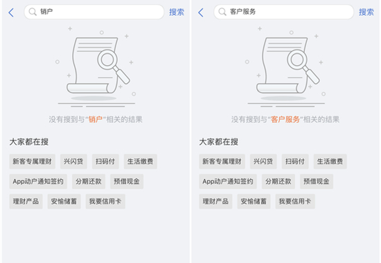 搜索互动方面,兴业银行APP在4大栏目页顶部均设有搜索框,也支持语音搜索,但互动体验不够好。第一,用户点击/退出搜索,会有一个从上到下拉出/从下到上抽出新页面的交互,用户需一定等待时间,而其他银行基本是直接调出搜索;第二,模糊搜索匹配程度不高,诸如客户服务、商城等已有功能搜不出;第三,搜索不到结果时,无法联动客服。