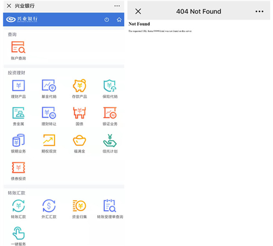 此外,用户可以搜到“兴业银行”小程序,提供理财产品、网点查询和信用卡服务,其中理财产品会引导新户到就近网点购买。