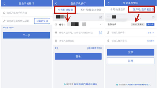 登录方面,兴业银行APP依然延续了去年评测时的复杂模式。用户首次登录需先输入“手机号+验证码”,进入登录页面,在“卡号快速登录”和“客户号/登录名登录”两种登录方式中选择一种。其中,“卡号快速登录”需要输入证件号+取款密码;“客户号/登录名登录”需要输入客户号+登录密码,若用户此前没有客户号/登录名(或忘记),需要通过“卡号+证件号+密码注册”(或找回)。与同业相比,此种登录方式较为繁琐。