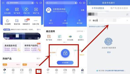 兴业银行APP基于机型支持刷脸、指纹、手势密码快捷登录方式,且可以切换。不过,用户打开APP默认进入“首页”,点击“我的”不直接跳出登录页面,还需要再次“点击登录”才跳往登录页面;超时退出点击“重新启动”也不直接跳往登录页面,而是跳到“首页”再重复上述过程。