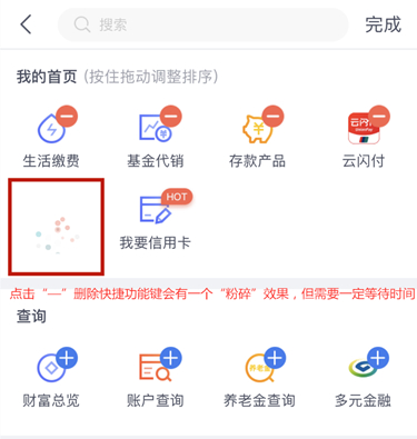 此外,兴业银行APP有些交互设置了效果,比如上文所述的“搜索”启用和退出,再就是“定制首页”删除快捷键时“粉碎”效果。虽然看起来有点炫酷,但都需要用户花费更长的等待时间,两者之间是否需要取舍或均衡?这也是一个值得思考的问题。