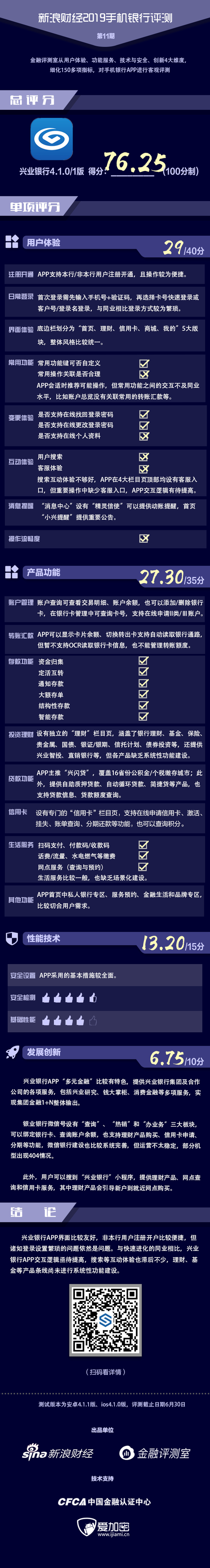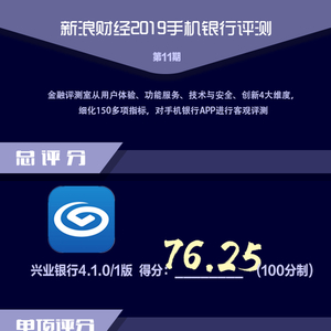 金融评测室综合用户体验、产品功能、性能安全、创新发展4大维度,150多项细分指标对兴业银行手机银行APP进行全扫描,最终给予76.25分(总分100)。