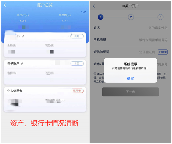 浦发银行APP “我的账户”可以看到名下银行卡情况,也可以看到资产状况查看资产状况。点击银行卡,可以查余额、查明细,也可以进行账户降级、挂失等管理操作。值得注意的是,用户可以查看完整卡号,但无法复制卡号,也不支持II类/Ⅲ账户申请。