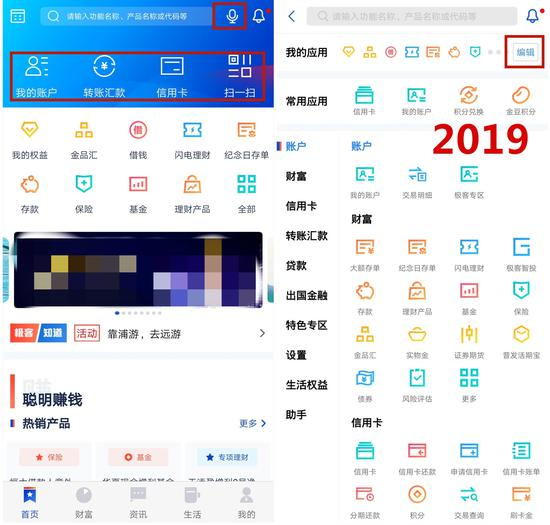 浦发银行APP界面比较友好,底边栏划分为“首页、财富、资讯、生活、我的”5个功能板块。相比去年,APP将“语音银行”功能键移到了导航条位置。此外,用户下拉APP首页也可以弹出“语音银行”,替代去年下拉后查看“资产、负债和财富”。