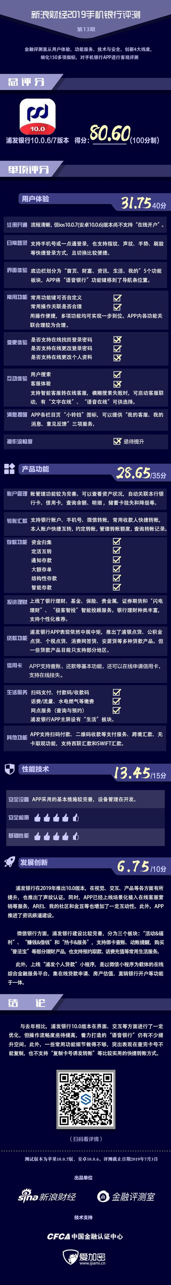 金融评测室综合用户体验、产品功能、性能安全、创新发展4大维度,150多项细分指标对浦发银行手机银行APP进行全扫描,最终给予80.60分(总分100)。