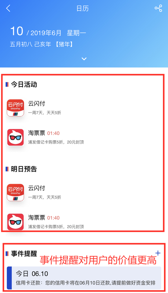 其他体验方面,浦发银行APP“首页、财富和生活”栏目页导航条设有“日历”入口,可以手动添加事件提醒。但与同业对比,该功能实用性不够强,页面大部分内容在提示今天、明天的优惠,而对用户最有用的还款日期等金融提醒放在最下方。