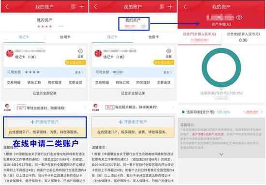 中信银行APP账户管理功能完善,用户点击“账户”可以看到下挂银行卡、信用卡,可以添加本行账户(提示已有账户),也可以开通电子账户,还可以点击“我的资产”查看资产/负债情况。其中,可以看到每个账户的基本情况(卡号、余额等),也可以进行银行卡设置、信用卡设置。