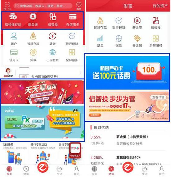 投资理财方面,中信银行APP有专门的“财富”板块,涵盖智慧存款、银行理财、基金、保险、贵金属等,也提供余额理财“薪金煲”、智能投顾“信智投”、转让专区、银证转账,外汇交易等仍需下载“信汇投资”APP。对于高净值客户,中信银行还上线了私行代销产品,包括信托与资管。