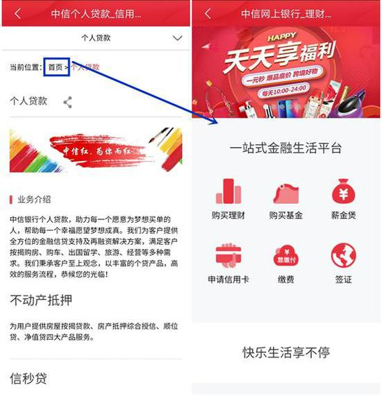 值得注意的是,中信银行APP贷款版块的部分交互模式依然延续去年的路线,不像APP的一个栏目版块,更像是将WAP搬上了手机银行。比如,部分交互直接返回中信银行WAP端。