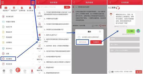 除了语音服务,中信银行在“首页、我的”页面右上角“消息”提供“我的客服”,但此项服务存在至少以下问题:第一,必须在常用问题列表里搜索/选择一项问题,但查询没结果时没有进一步提示;第二,如果用户想咨询智能客服,必须选择“未解决”才能进入,而同业做法基本是允许用户在问题列表/咨询客服中二则其一;第三,更没有达到先进同业的水平,在用户遇到障碍的步骤直接进入客服。不过,也有两点做得不错,一是可以直接转入电话客服,二是支持智能转人工服务。