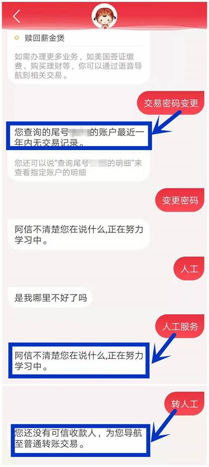 中信银行APP的客服体验表现不尽人意。APP激活客服有两个方法,用户点击页面底边栏下方的“e”标志可以向智能客服“阿信”询问,页面有常见问题列表,支持语音输入。但在测评中,新浪金融测评室发现“阿信”时常出现答非所问的情况,而且在回复“人工”、“转人工”等消息后,都不能跳出人工客服服务。此外,语音转账“向XX转入XXXX元”实现的前提必须是将收款人添加为“可信收款人”,而添加“可信收款人”又必须“登录网银使用Ukey”。